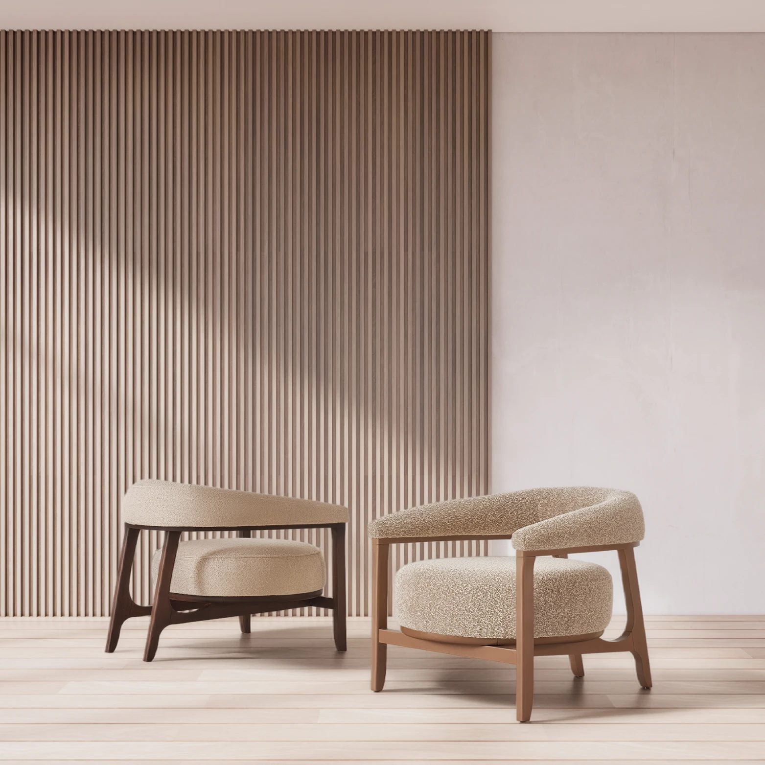 İnce ahşap detaylar, tasarımın zarif karakterini vurgularken koltuğun genel formuna sıcak bir dokunuş katar.